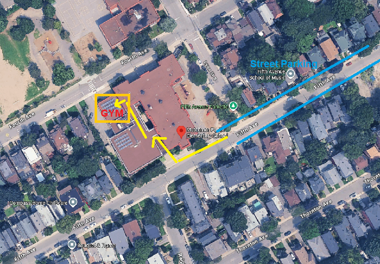 Although the school faces three streets, the main entrance is on fifth avenue. There is street parking available there.